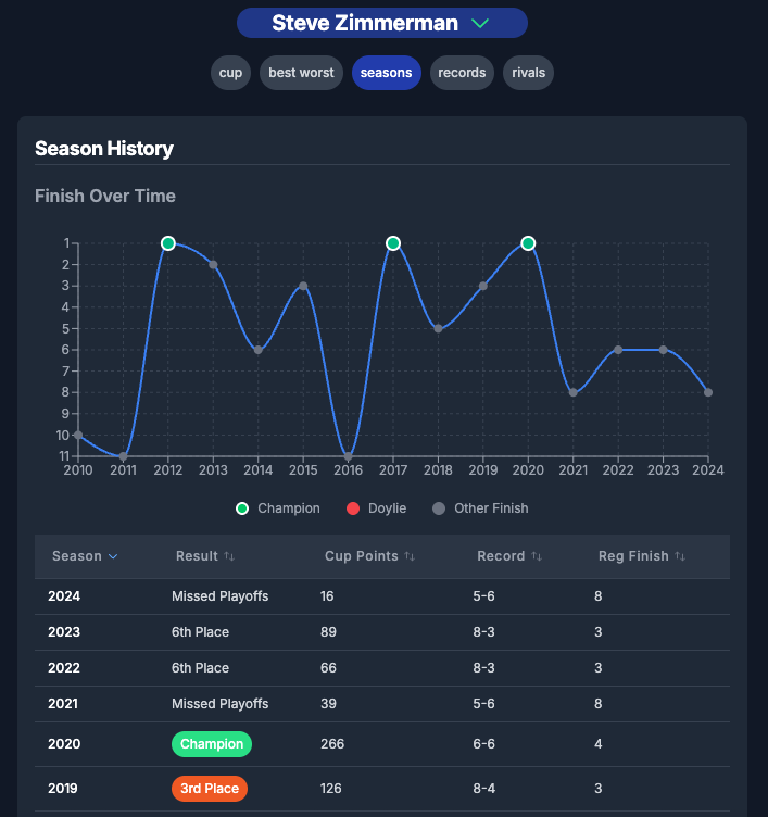 Cup Rankings are our proprietary scoring system that evaluates overall league performance across multiple seasons. It considers championships, playoff appearances, regular season records, and consistency to determine the most successful managers.